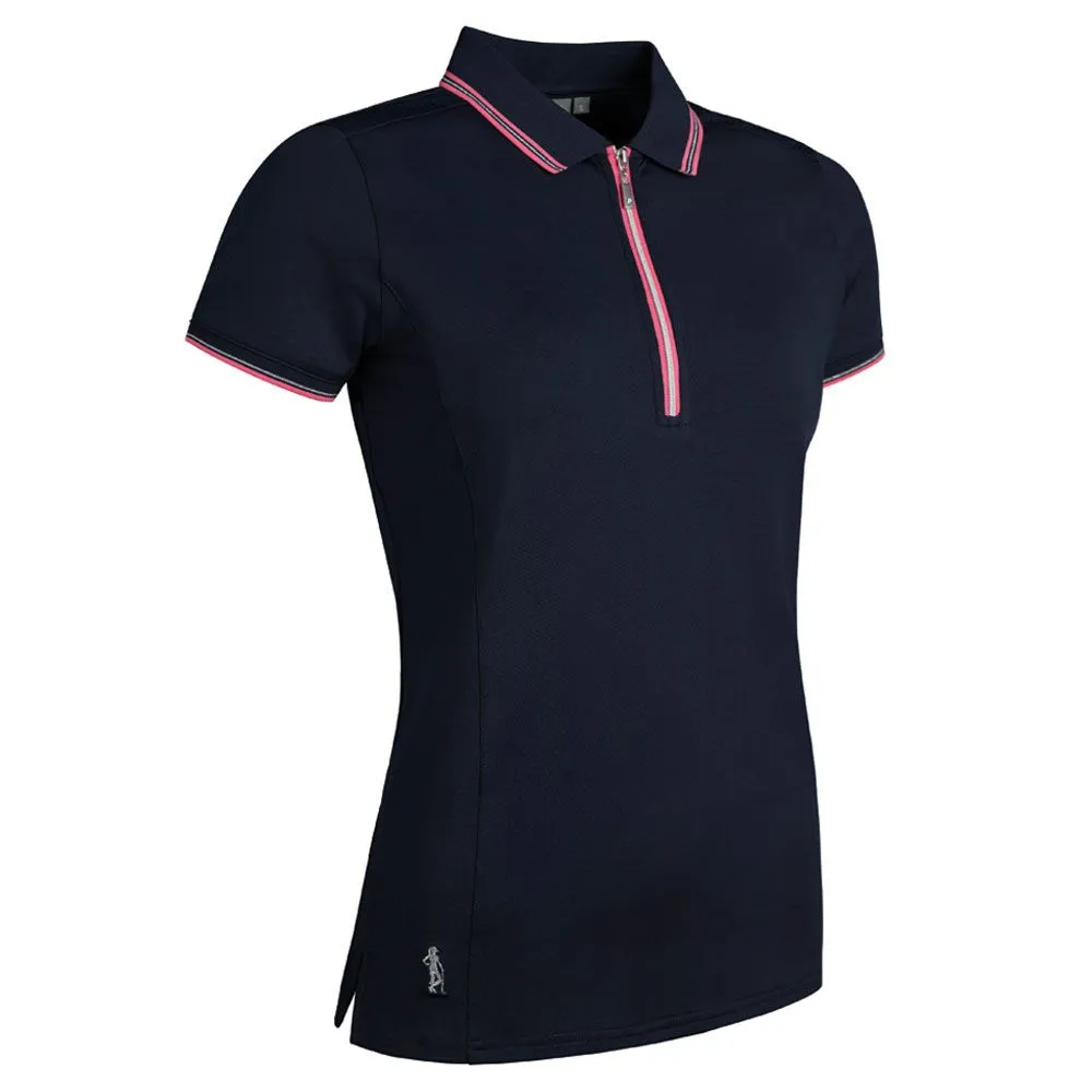 The Glenmuir Ladies Stella Golf Polo Shirt has a flattering style with a zip neck with a high shine zip, and silver lurex stripe details to the tipping on the anti-curl rib collar and cuffs. This shirt features 4-way stretch for complete freedom of movement, and active smart fibre which is capable of regulating body heat has excellent moisture-wicking properties and a +40 UV sun protection for your skin. Finished with mesh panels on the shoulders and back for added breathability, the Stella Golf Polo Shirt is perfect for the warmer months of golf.