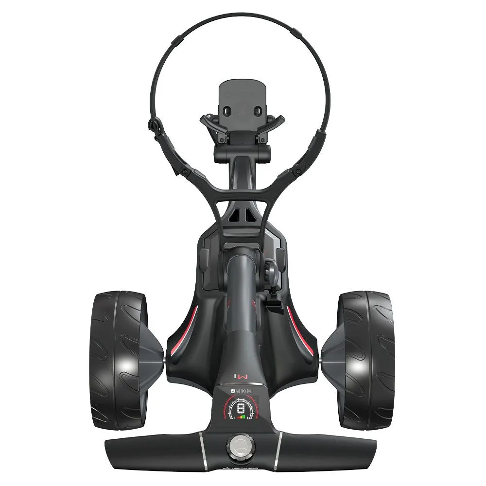 Motocaddy has used a super-light Lithium battery on the new M1, which is 33% smaller compared to the nearest competitor, to drive a powerful, whisper-quiet 230w motor for excellent handling and performance on the course. The M1 also offers on board charging of the battery which means no struggling to remove the battery to charge it which makes life much simpler and an advanced battery meter lets you keep an eye on your battery life whilst you’re out on the course.