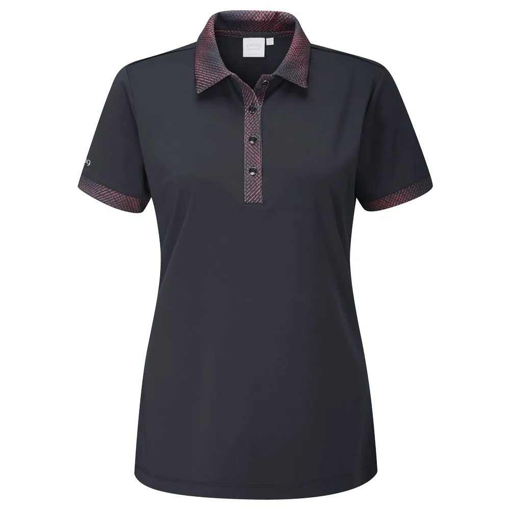 The Ping Ladies Etta Golf Polo Shirt features an eye-catching print and SensorCool technology to help you look and feel good on the course. SensorCool fabric draws moisture away from the skin so it can evaporate and you stay dry and comfortable when the heat is on. The fabric is also quick-drying and crease-resistant, so it will always look good and the addition of Elastane to the mix also provides added stretch, allowing you to move freely through your game. A contrasting collar, cuffs, placket and stripe down the centre back finishes off the look perfectly.