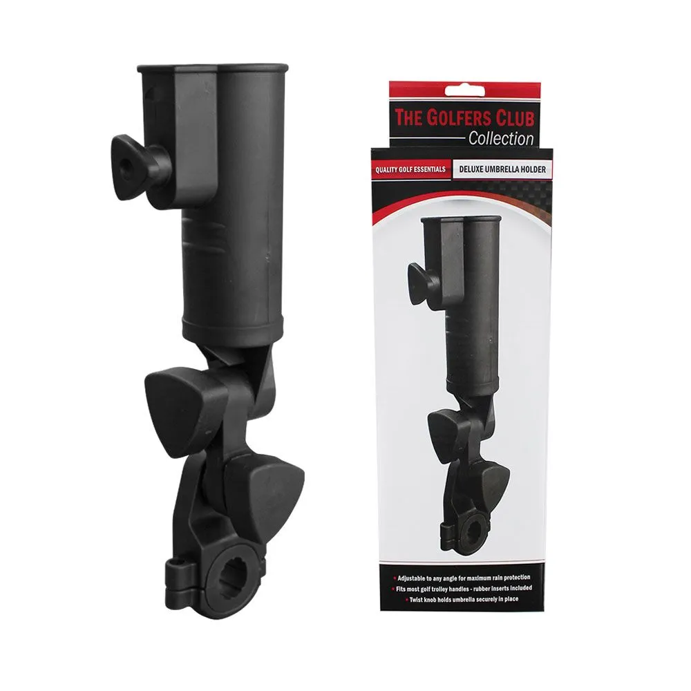 The Golfers Club Deluxe Umbrella Holder has rubber inserts allow for a secure fit to most trolley handles and it is easy to operate with the twist of a knob to hold your umbrella securely in place. This umbrella holder can also be adjusted to any desired angle to give you maximum protection from driving rain, allowing you to get out on the course, whatever the weather throws at you.