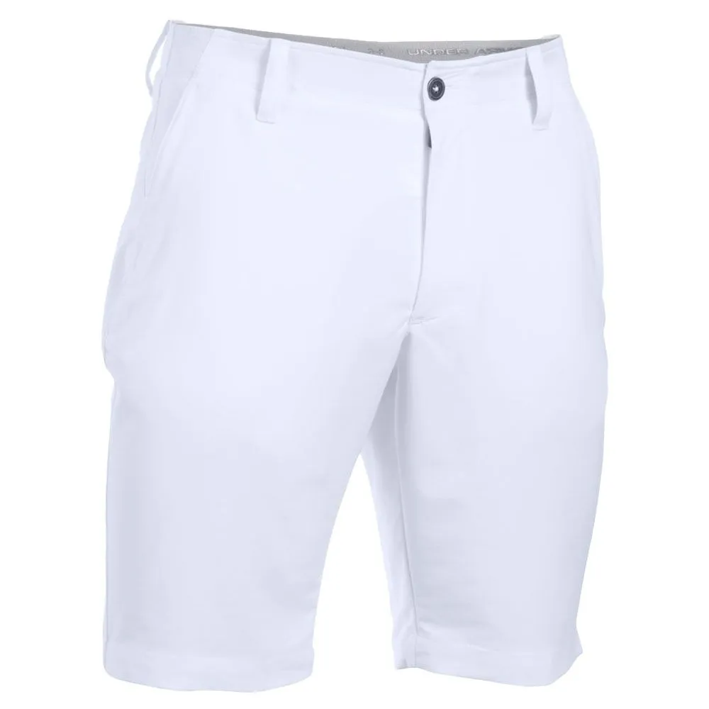 The Men’s Under Armour Matchplay Tapered Golf Shorts have a modern, flat front design and are constructed using a lightweight and durable HeatGear ® fabric. HeatGear ® will wick sweat away from your skin, pulling it to the garment’s surface and speeding evaporation which will keep your body feeling cool and dry so you can perform at your best on the course. The polyester/elastane fabric blend gives that extra bit of stretch for greater freedom of movement and a stretch-engineered waistband allows for a perfect fit. The use of rubber Under Armour printing inside the waistband also also helps to keep your shirts tucked in place throughout your swing. These shorts are a slim fit design and are finished with two front slash pockets and two rear pockets and an embroidered Under Armour logo above the right pocket – a stylish addition to your summer clothing range.